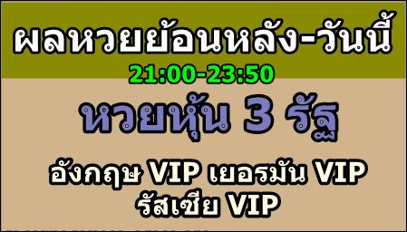 ธันวาคม 2568 วันที่ 1 ถึงวันที่ล่าสุด - รวมข้อมูลผลหวยย้อนหลัง หวยหุ้น 3 รัฐ เวลา 21:30 - 23:50 เริ่มต้นจาก หวยอังกฤษ VIP เยอรมัน VIP รัสเซีย VIP พร้อมสถิติตัวเลขที่น่าสนใจ เช่น เลขตามวัน ตามวันที่ เลขวิ่งรูด ที่อาจจะใช้เป็นแนวทางหวยสำหรับงวดถัดไปได้