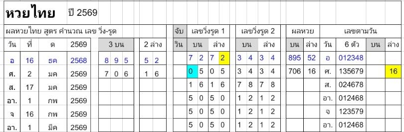 ไฟล์สำหรับแอปชีต ไว้ใช้เก็บผลหวยไทย ออกเดือนละ 2 ครั้ง 1 และ 16 ของทุกเดือน พร้อมสูตรคำนวณหาเลขวิ่งรูดในตัว คำนวณเลขอัตโนมัติเมื่อป้อนผลหวยล่าสุดลงไป เพื่อใช้กับงวดถัดไป