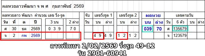 ผลหวยลาวพัฒนา - กุมภาพันธ์ 2569 วันที่ 1 - 28