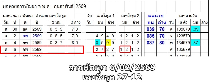 ผลหวยลาวพัฒนา - กุมภาพันธ์ 2569 วันที่ 1 - 28