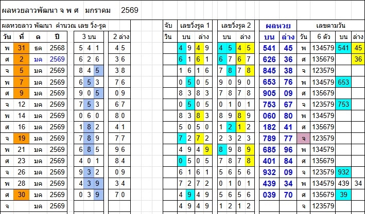 ผลหวยลาวพัฒนา - มกราคม 2569 วันที่ 1 - 31